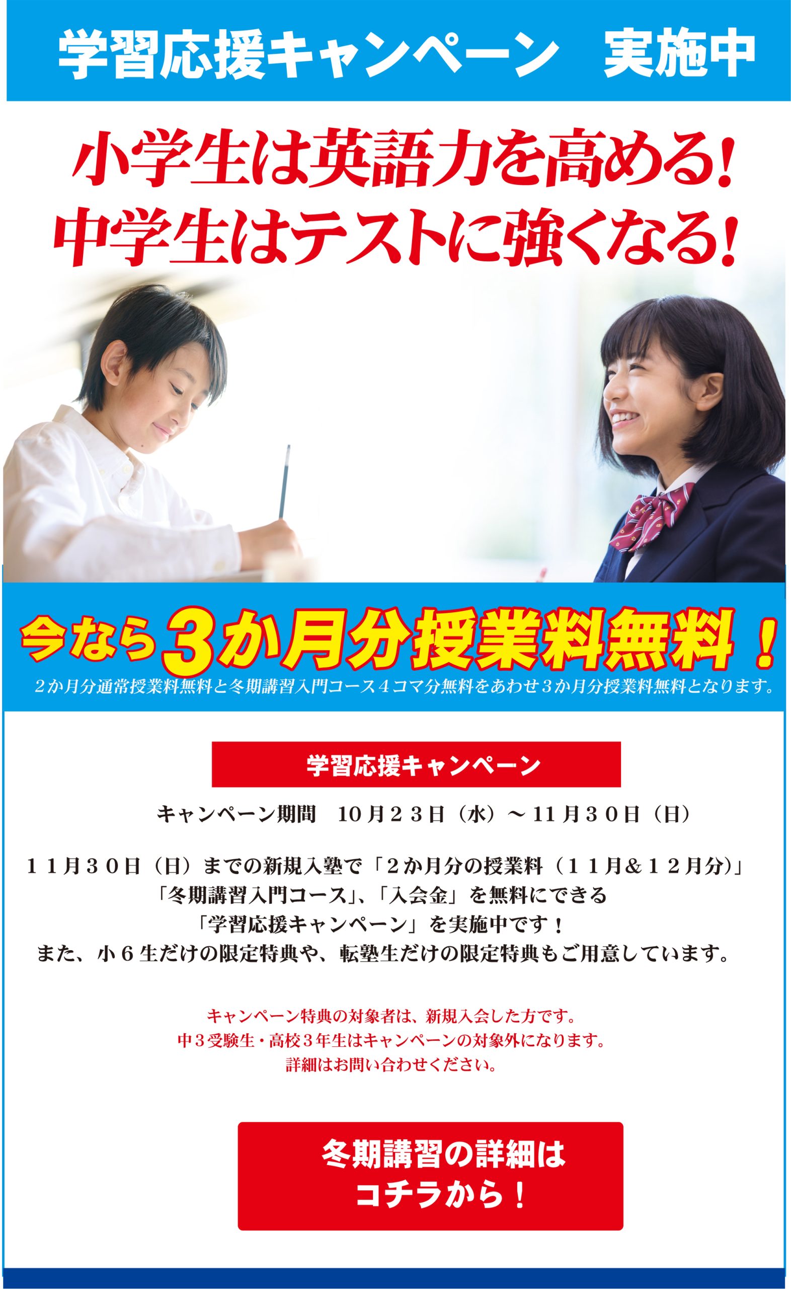 ただいま大変、費用がリーズナブルになる「学習応援キャンペーン(11月30日まで)」を実施中です。学習の質・量を高めるためにご活用ください。