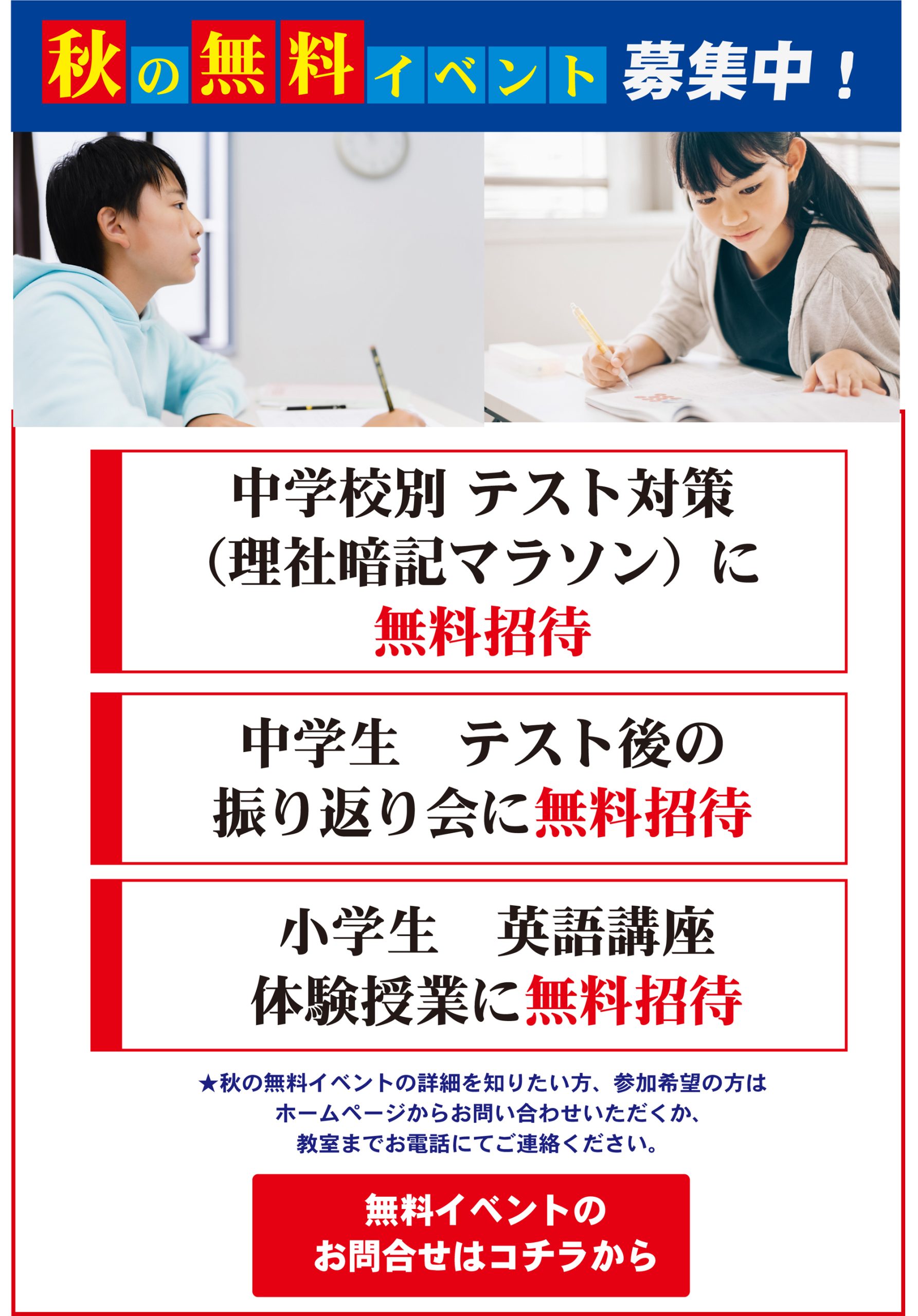 また、秋の無料イベントとして中学生対象のテスト対策授業&テスト後の振り返り会を開催。小学生向けの「小学生英語講座 体験授業」も募集中です。「小学生英語講座」は英検の取得を目指した中学校の英語でも大変、役立つ授業です。