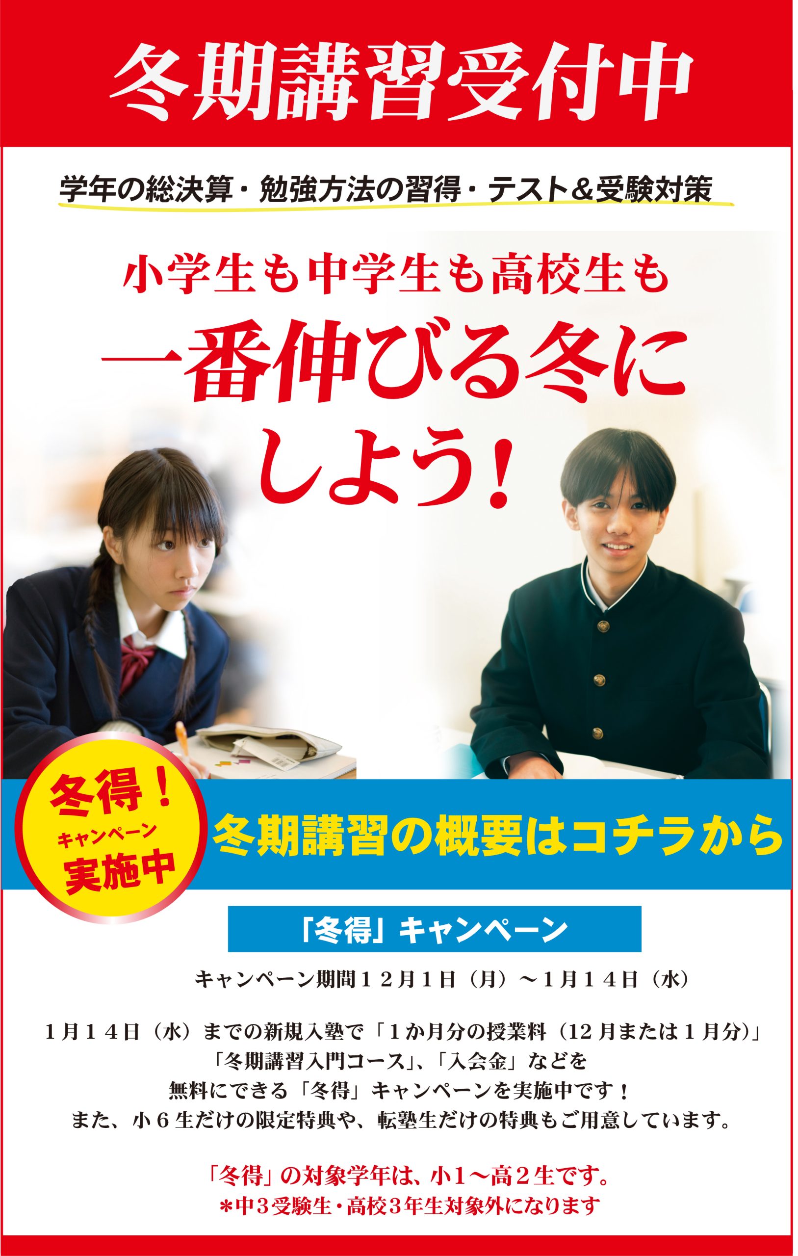 ただいま大変、費用がリーズナブルになる「冬得キャンペーン(1月14日まで)」を実施中です。学習の質・量を高めるためにご活用ください。