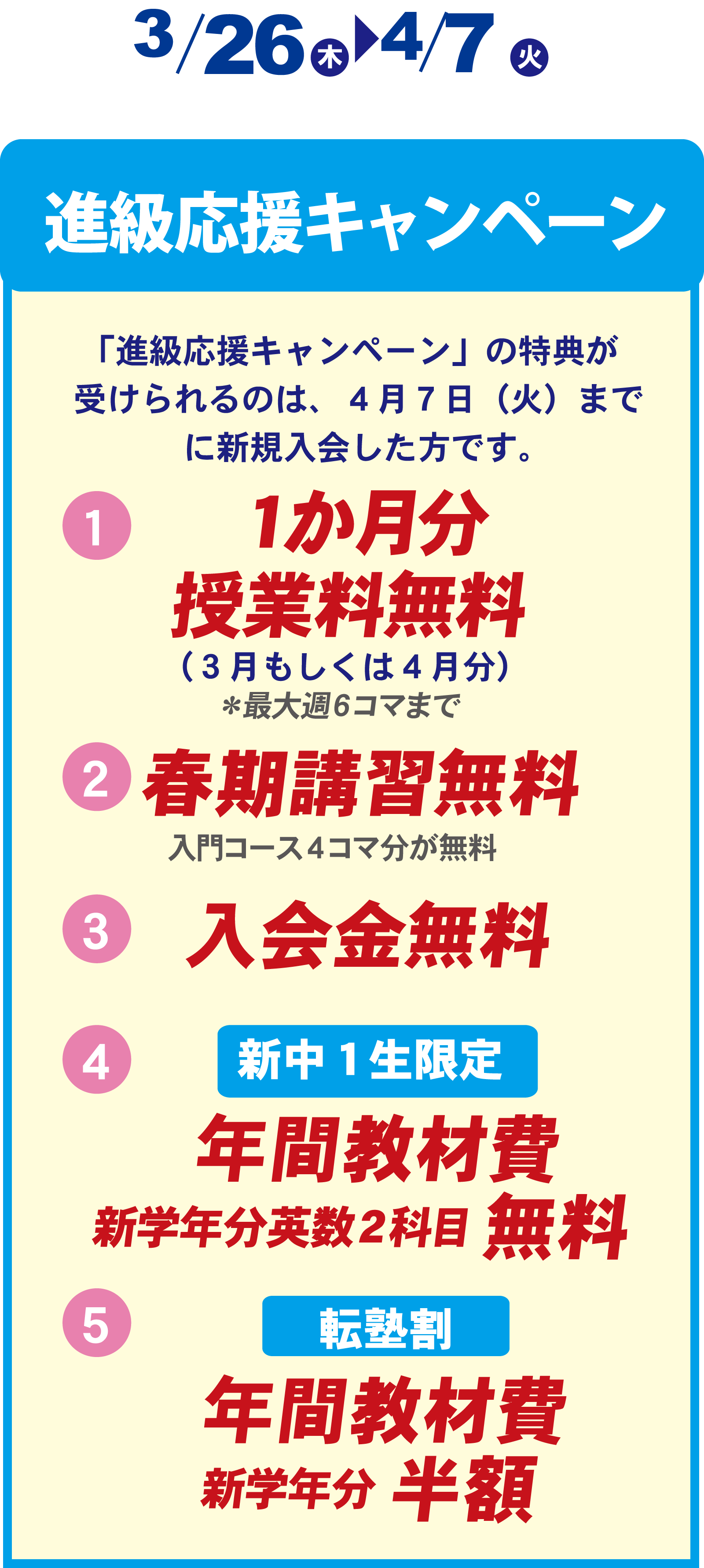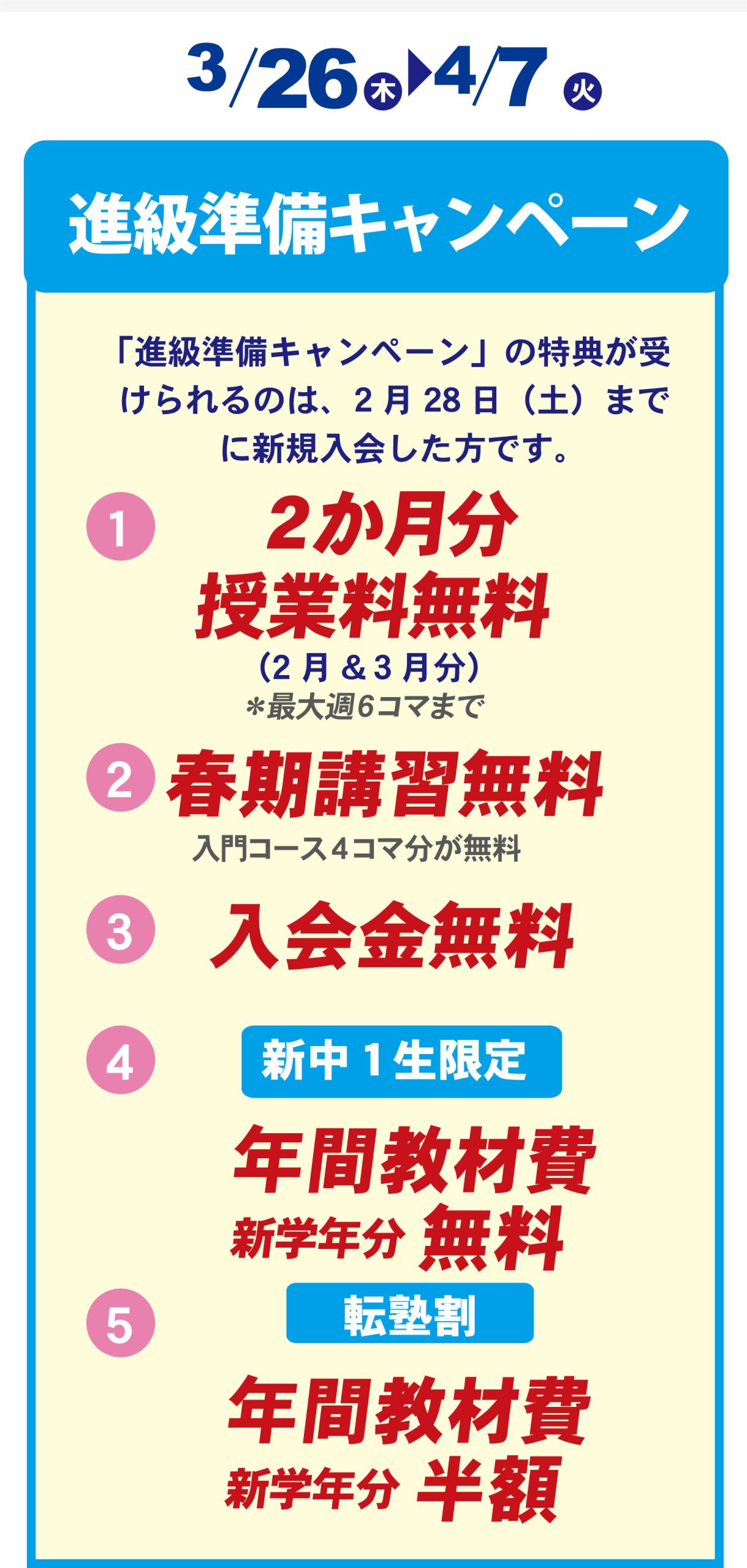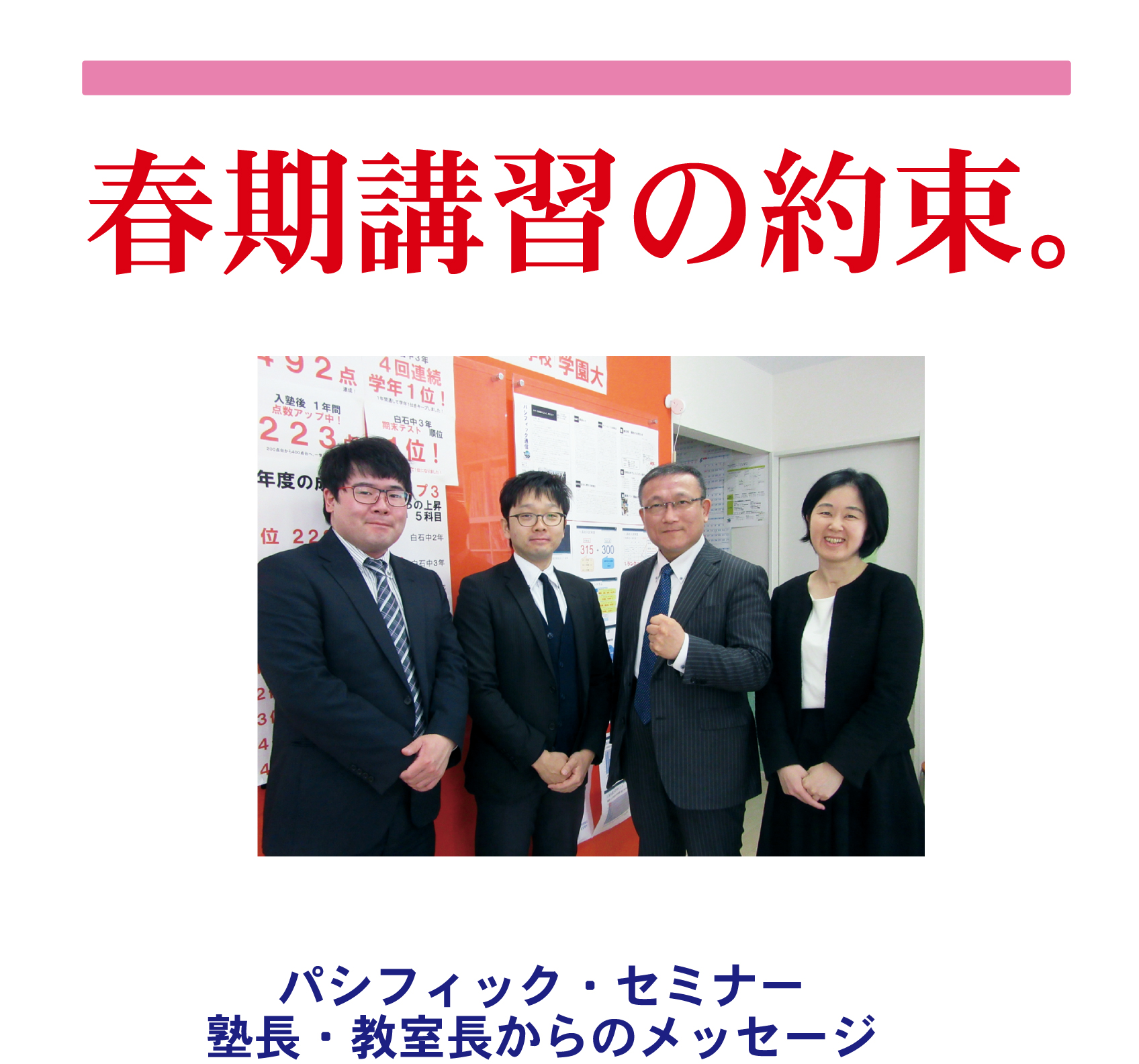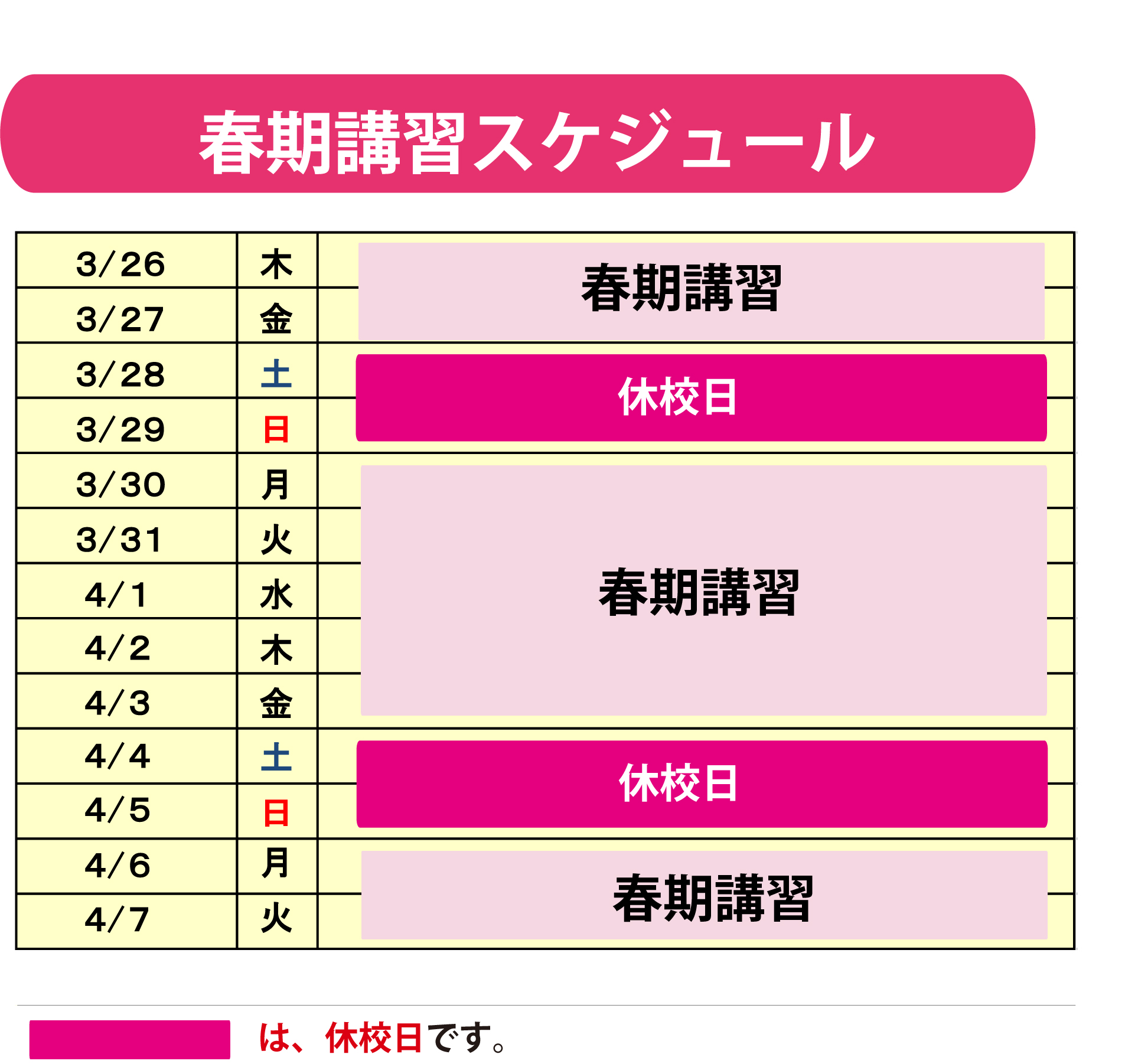 各ご家庭でご予定もあるかと思いますが、講習の日程を考慮の上、春休みの計画を立てていただければ幸いです。