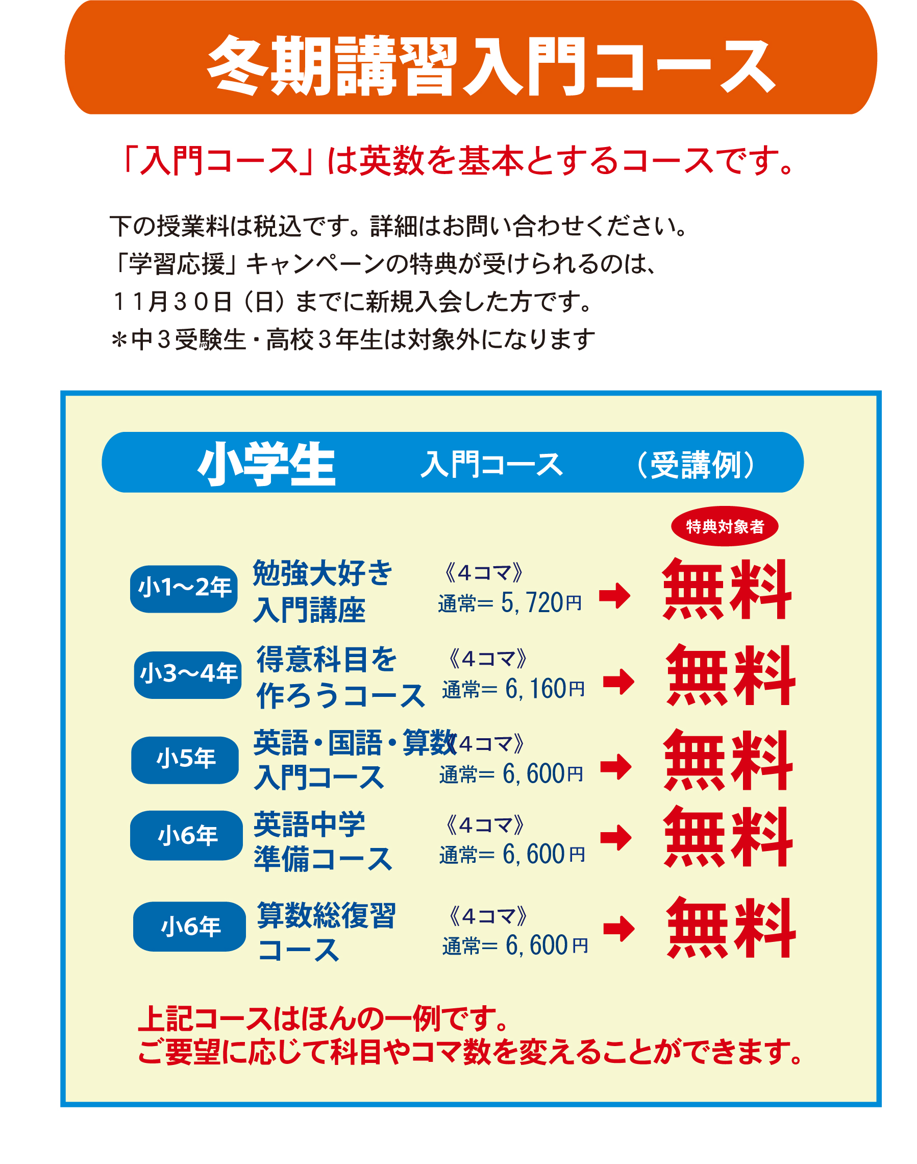 各ご家庭でご予定もあるかと思いますが、講習の日程を考慮の上、冬休みの計画を立てていただければ幸いです。