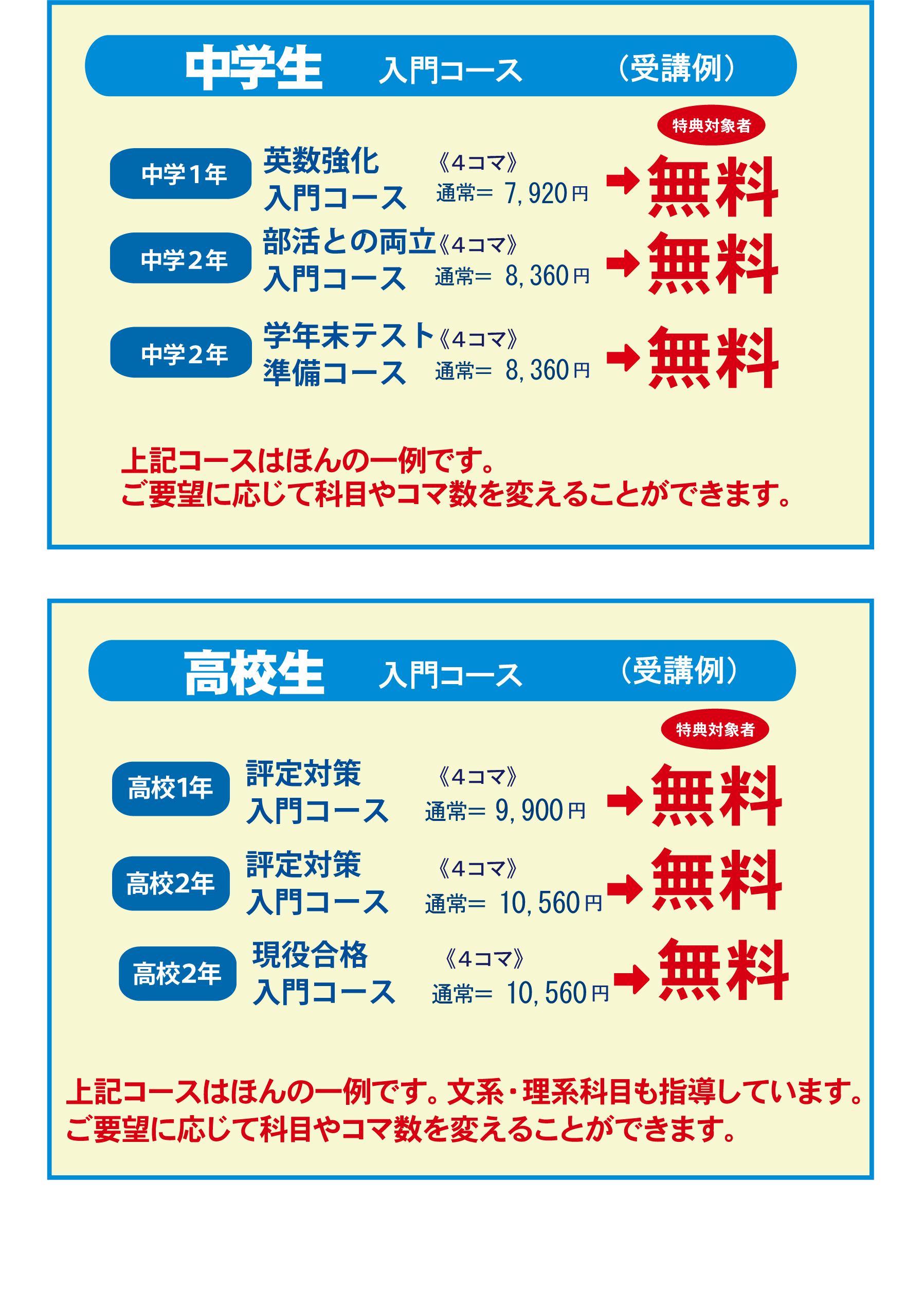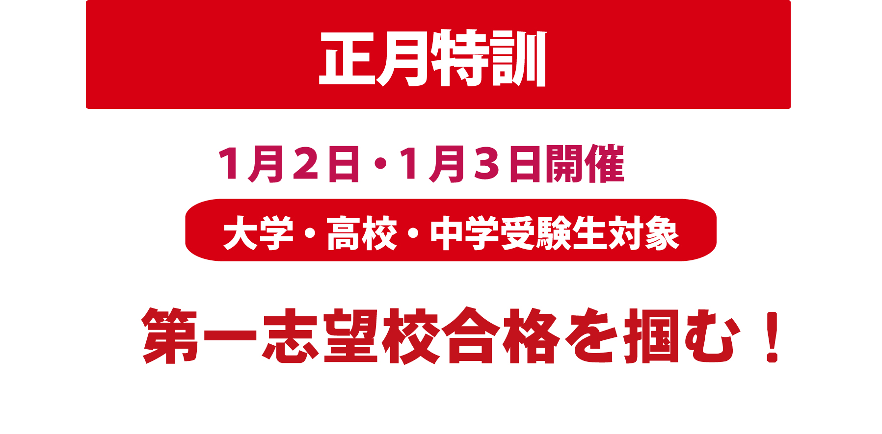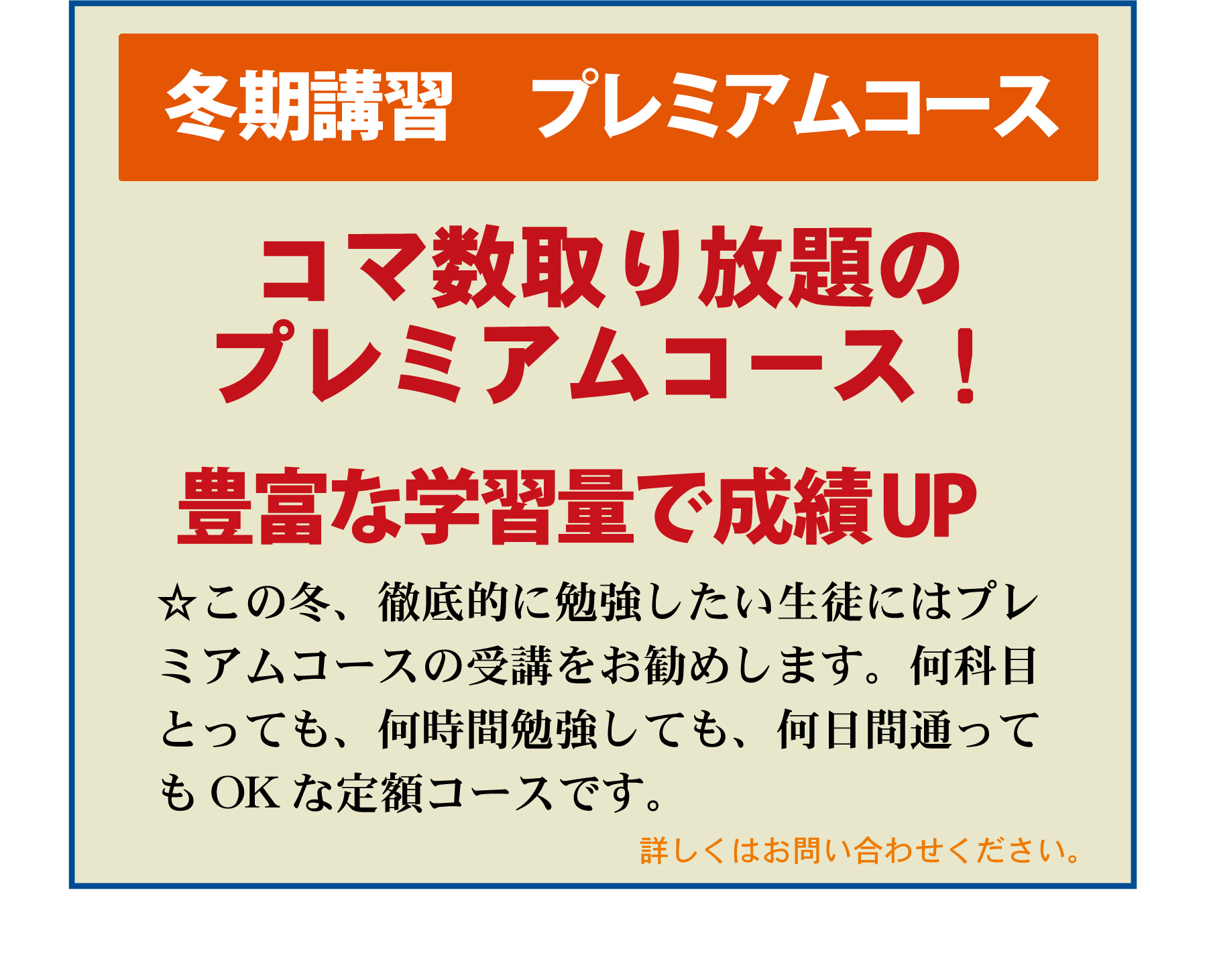 受験生は、合格へのラストスパートをスタッフ一同が全力で応援します。1月2日・1月3日には、「あんなに頑張ったのだから必ず合格できる!」という自信をつける「正月特訓」を開催。また、冬期講習中に、徹底的に勉強したい生徒には何科目とっても、何時間勉強しても、何日通ってもOKな定額のプレミアムコースも用意しています。